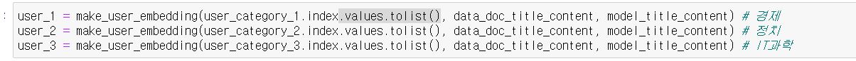 만들어두었던 make_user_embedding 함수에 각 사용자가 본 뉴스 기사의 index list를 전달해줍니다.