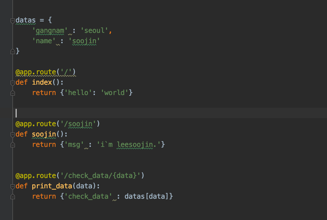 @app.route('/soojin')과 같이 만들고 그에대한 return 값으로 'msg' : 'i`m soojin'이라고 하겠습니다.