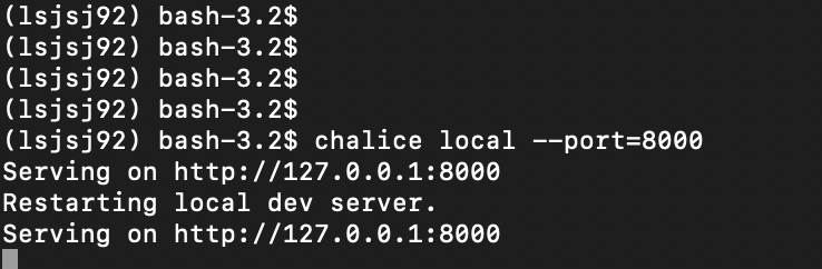 chalice local --port=8000 의 명령어로 실행하면, local에서 실행이 됩니다.