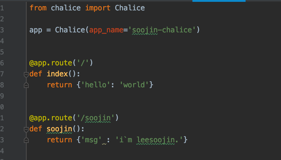 자! 그러면 뭔가 기능을 넣어야겠죠? AWS Chalice의 장점은 REST API 형식으로 데이터를 호출할 수 있습니다.