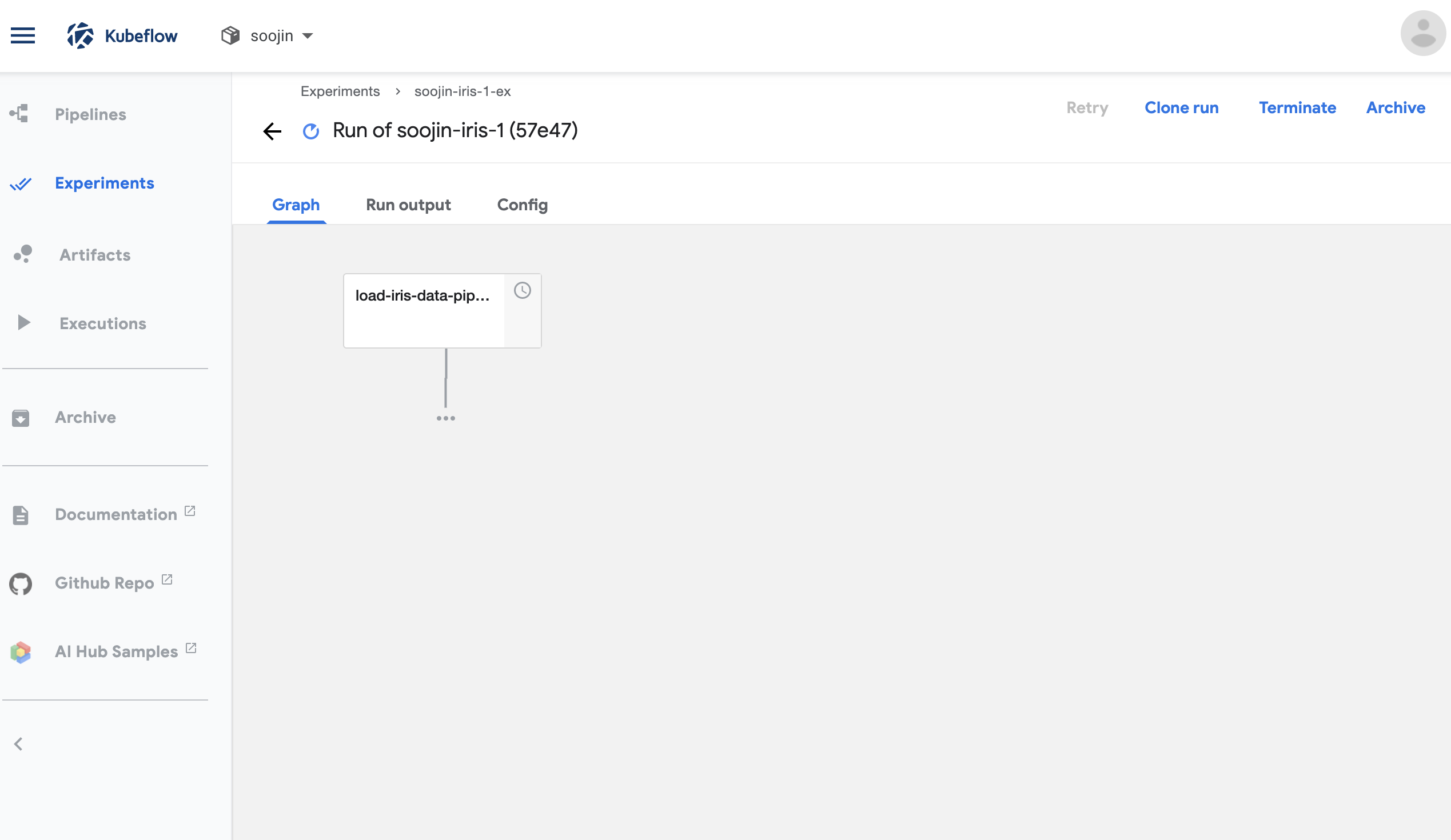 클릭해서 들어가게 되면 kubeflow pipeline이 동작되는 순서가 눈에 보이게 됩니다. 저 graph 부분의 박스를 클릭하게 되면 동작되고 있는 log 등을 확인할 수 있습니다. 저는 iris data로 kubeflow pipeline을 구성했기 때문에 굉장히 단순하고 빠르게 pipeline이 동작됩니다.