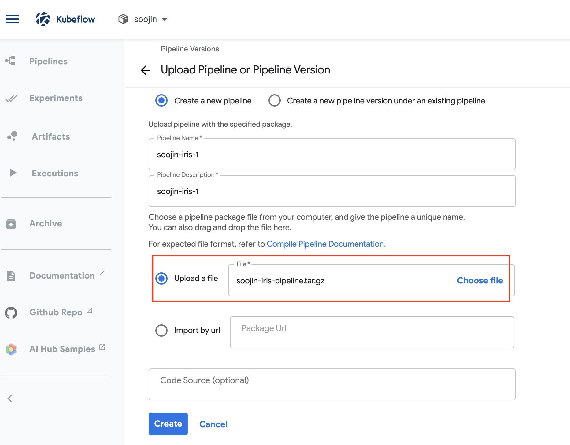 여기서 방금전에 만들었던 pipeline.tar.gz 파일을 업로드해주면 됩니다. 아래 사진과 같이 말이죠!
