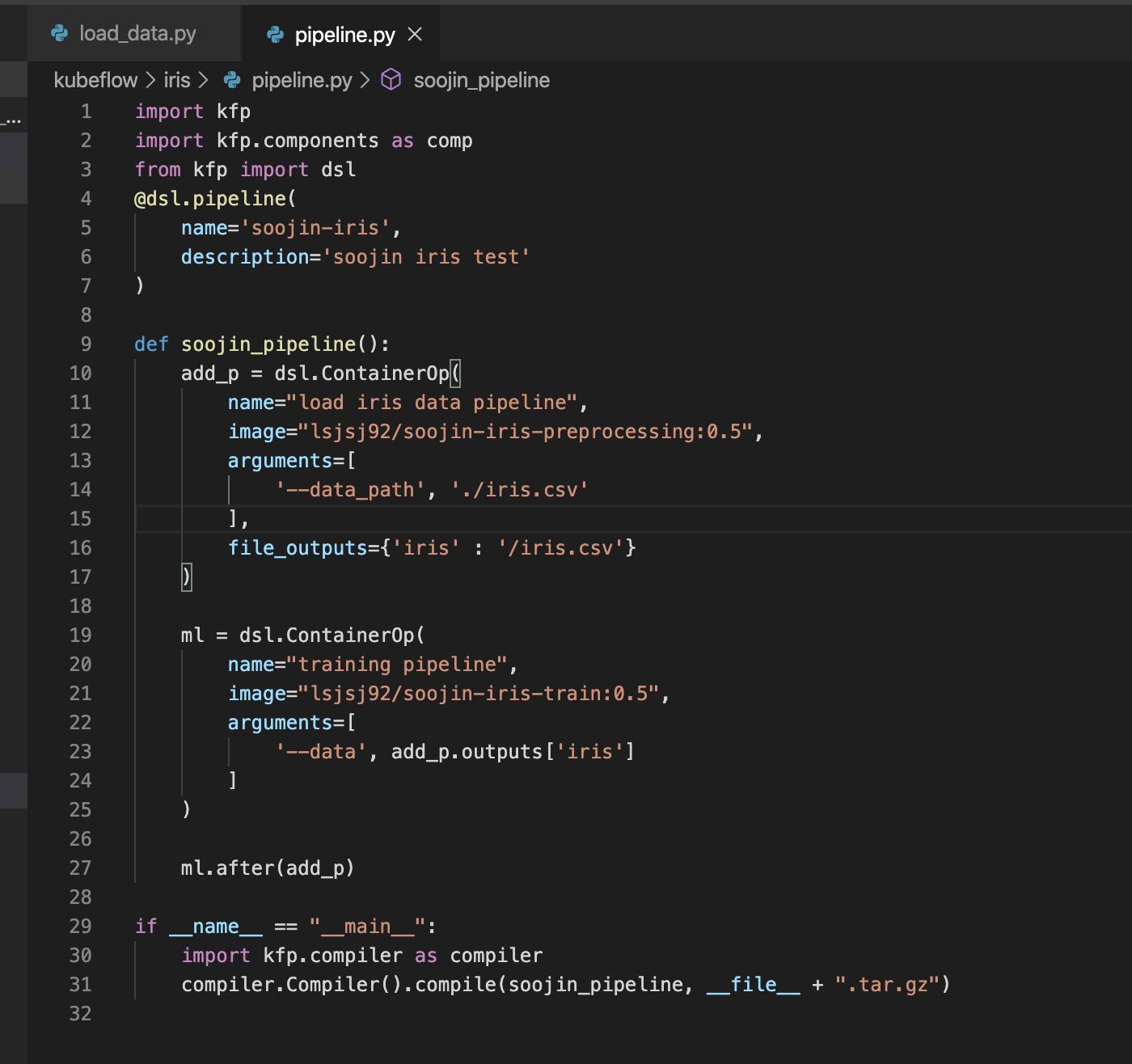 - 파일 : pipeline.py : kubeflow에서 사용할 pipeline을 구축할 코드입니다. 파이썬(Python) 기반으로 되어있습니다.