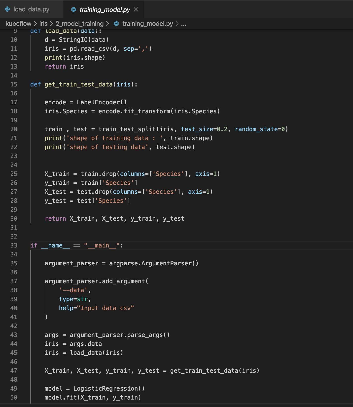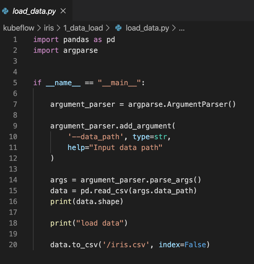 해당 코드는 굉장히 단순합니다. 굉장히 쉬운 예제인 iris data다보니 더욱 그렇습니다. 여기서 보셔야 할 것이 argument를 받는 부분입니다. 저는 1개의 argument를 받게 했는데요. 그 argument는 iris.csv 파일이 있는 경로를 지정할 수 있도록 data_path를 받도록 했습니다. 여기서는 그냥 단순히 iris data를 가져오고 shape를 찍어본 후 / 경로에 iris.csv 이름으로 데이터를 저장하도록 했습니다. (이렇게 저장하는 이유는 추후 pipeline 부분에서 설명합니다.)