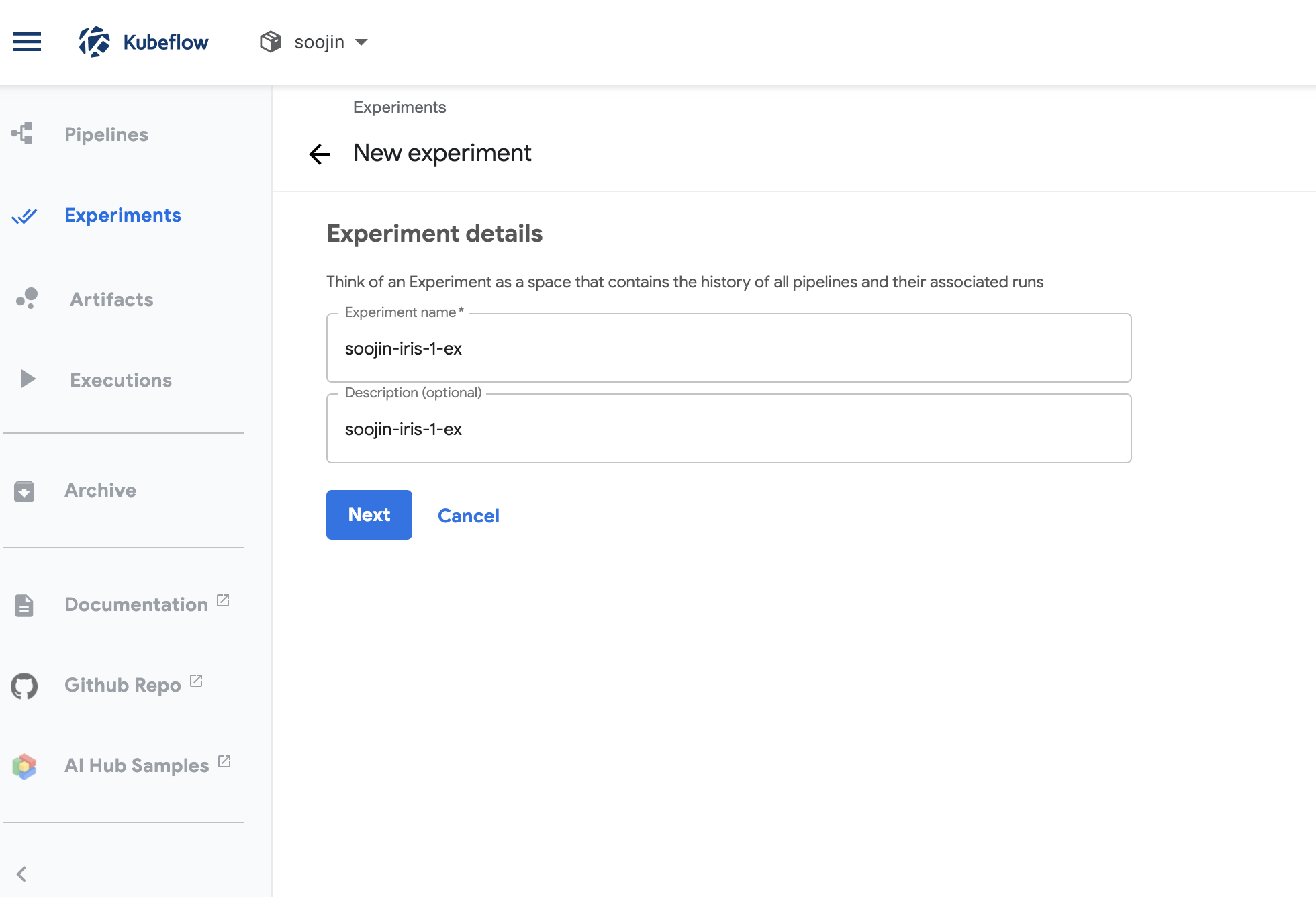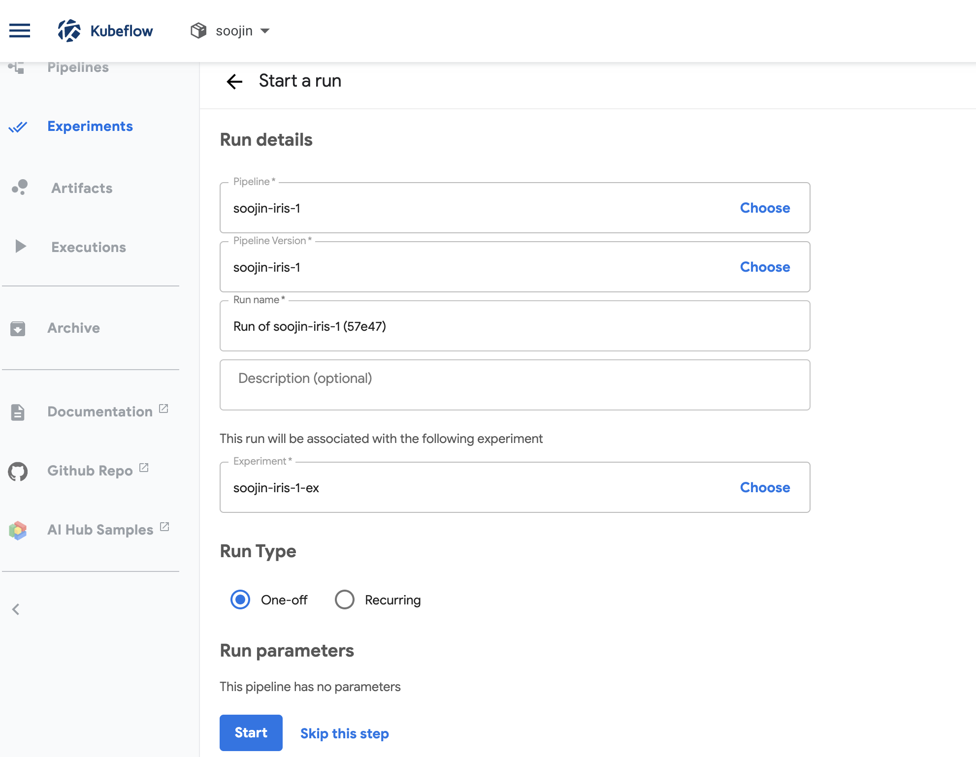 실험을 한다는 것은 이 파이프라인을 동작시켜보는 것입니다. 실험을 누르게 되면 experiment name 등을 입력하게 됩니다.