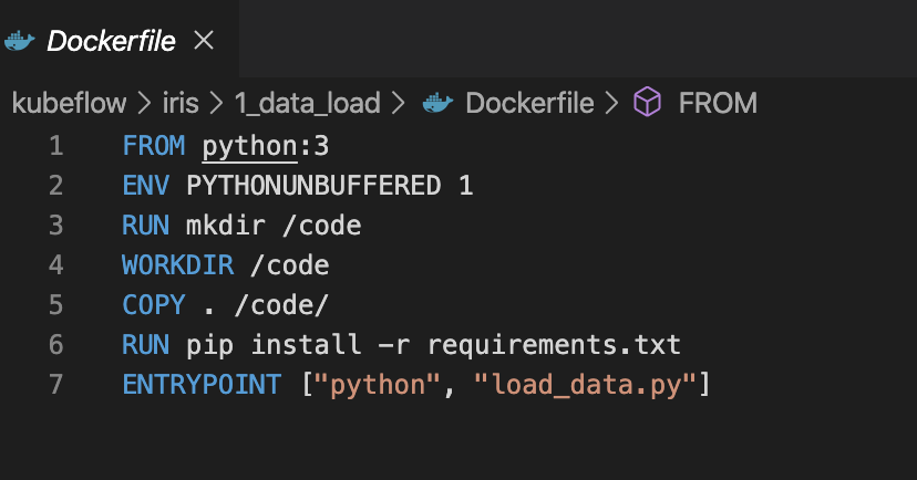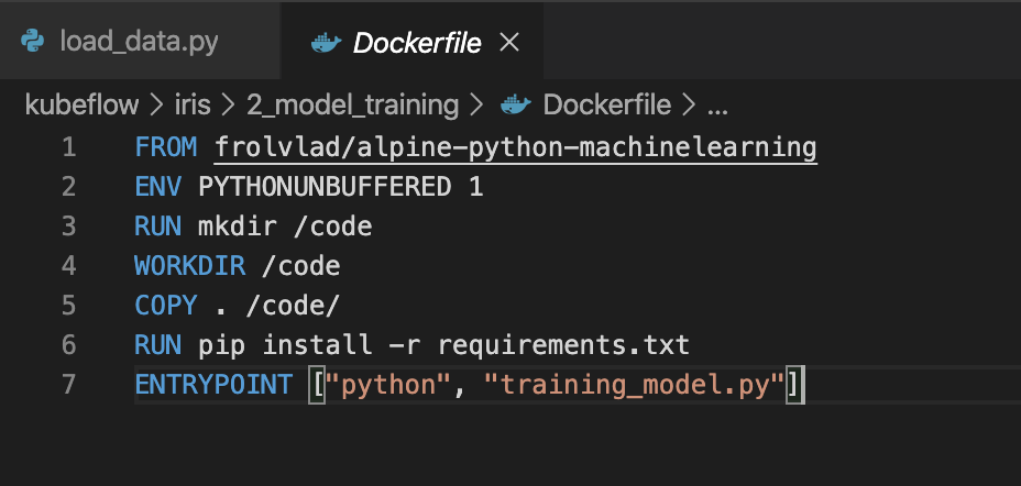 마찬가지로 여기서도 Dockerfile을 만들어줍니다. 그럼 이제 우리는 2개의 Dockerfile을 만드는 것입니다. 하나는 데이터 load를 위한 container, 하나는 모델 훈련을 위한 container입니다. 이 부분은 모델 훈련을 위한 container가 되겠죠?