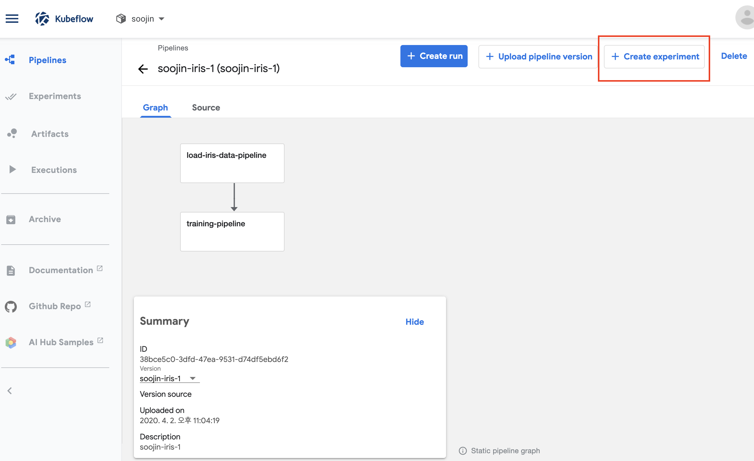 자! 여기까지 잘 되셨다면 아래 사진과 같이 kubeflow pipeline graph가 나오는 것을 확인할 수 있으실겁니다. 여기서 create experiment를 눌러서 실험을 해봅니다.