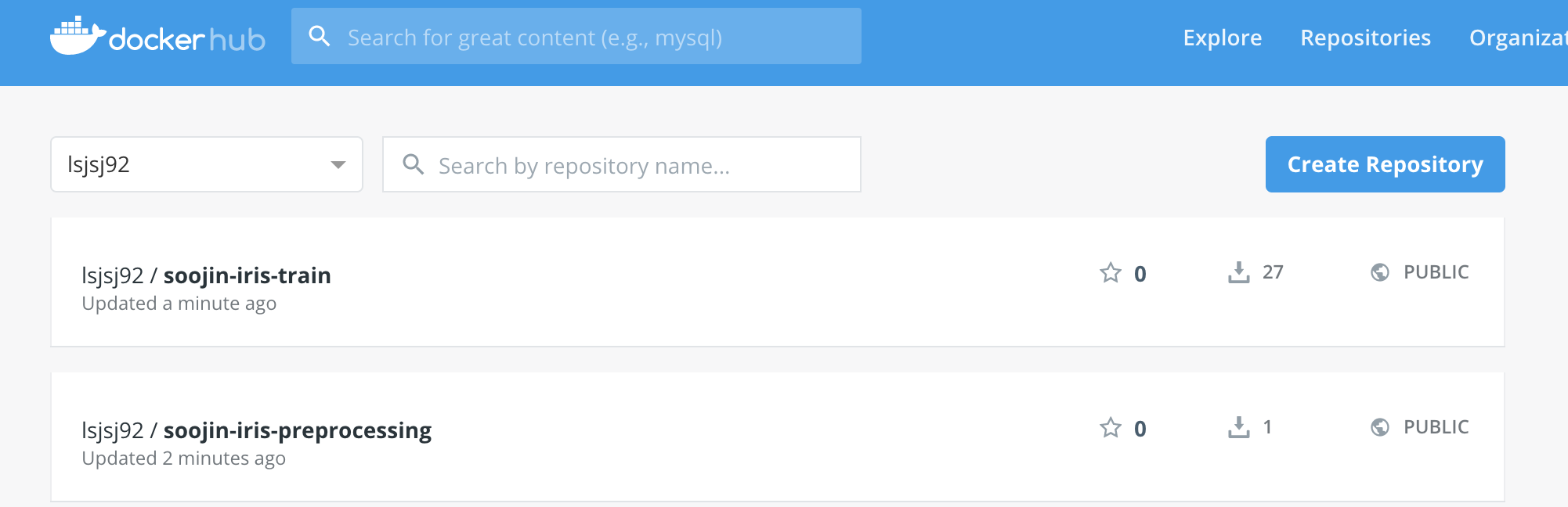 그러면 아래와 같이 본인의 docker hub 환경에 이미지가 올라간 것을 확인할 수 있습니다.