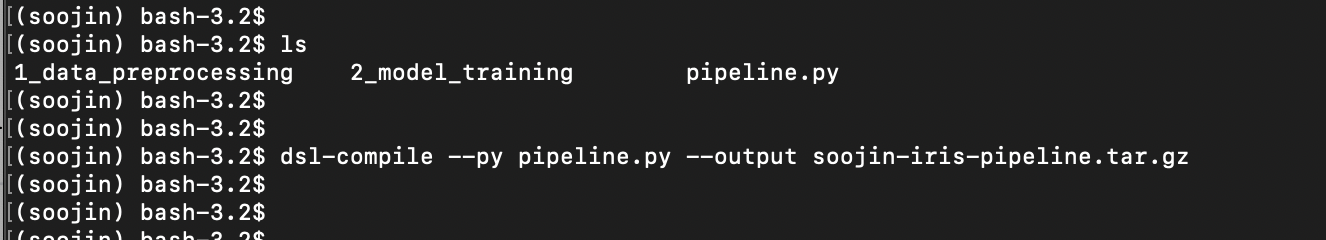 dsl-compile --py 파이프라인코드이름.py --outout 파이프라인이름.tar.gz