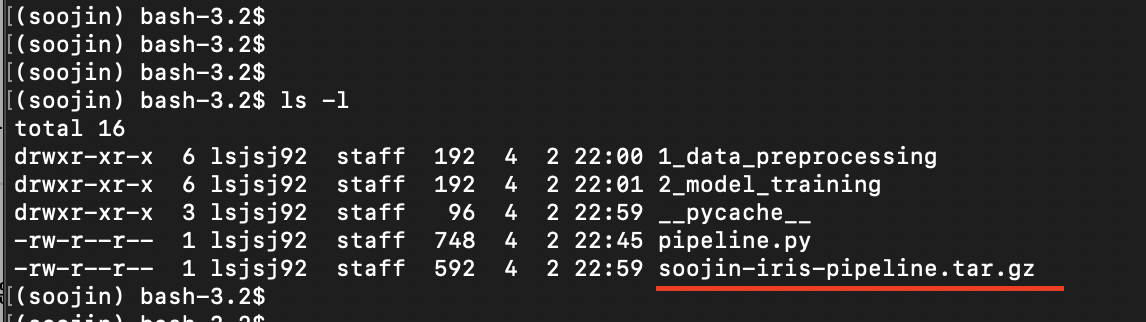 위 명령어를 입력하게 되면 아래와 같이 soojin-iris-pipeine.tar.gz 파일이 만들어지게 됩니다!