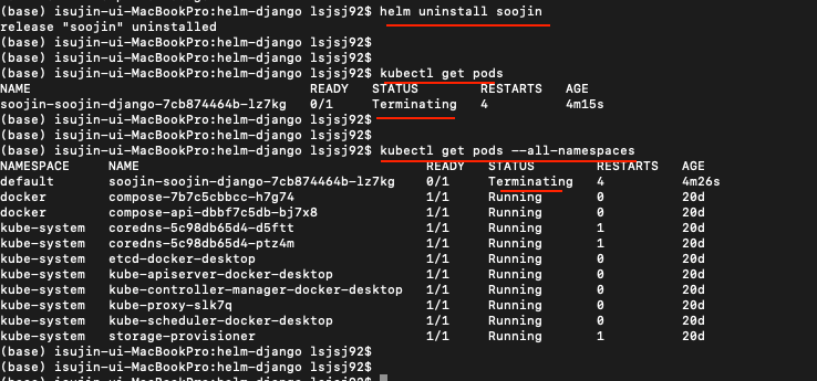 helm을 이용하면 kubernetes를 쉽게 배포하고 삭제할 수 있는데요. 아까 helm install로 설치했다면 이제 helm uninstall 명령어로 해당 환경을 지울 수 있습니다. 그러면 kubectl get pods --all-namespaces 등의 명령어를 보시면 Terminating 이라는 것을 볼 수 있게되고 시간이 조금 지나면 완전히 해당 pod는 사라진 것을 확인할 수 있을겁니다.