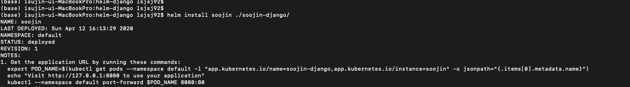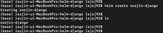 helm install soojin ./soojin-django/ 를 입력하게 되면 제가 방금 입력한 soojin-django 환경을 기반으로 helm 기반의 kubernetes를 생성해줍니다.