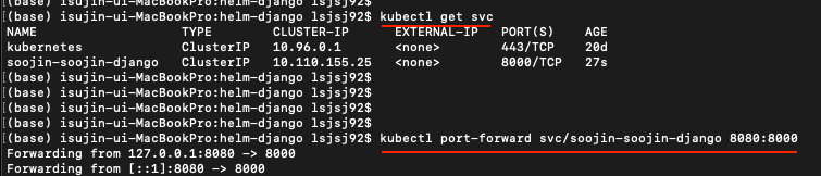 kubectl get svc를 입력하니까 soojin-soojin-django 이름의 환경이 8000번 포트에 떠있는 것을 확인할 수 있습니다. 그럼 이제 local 환경에서 port forward를 통해 해당 helm kubernetes django 환경에 접속합니다.