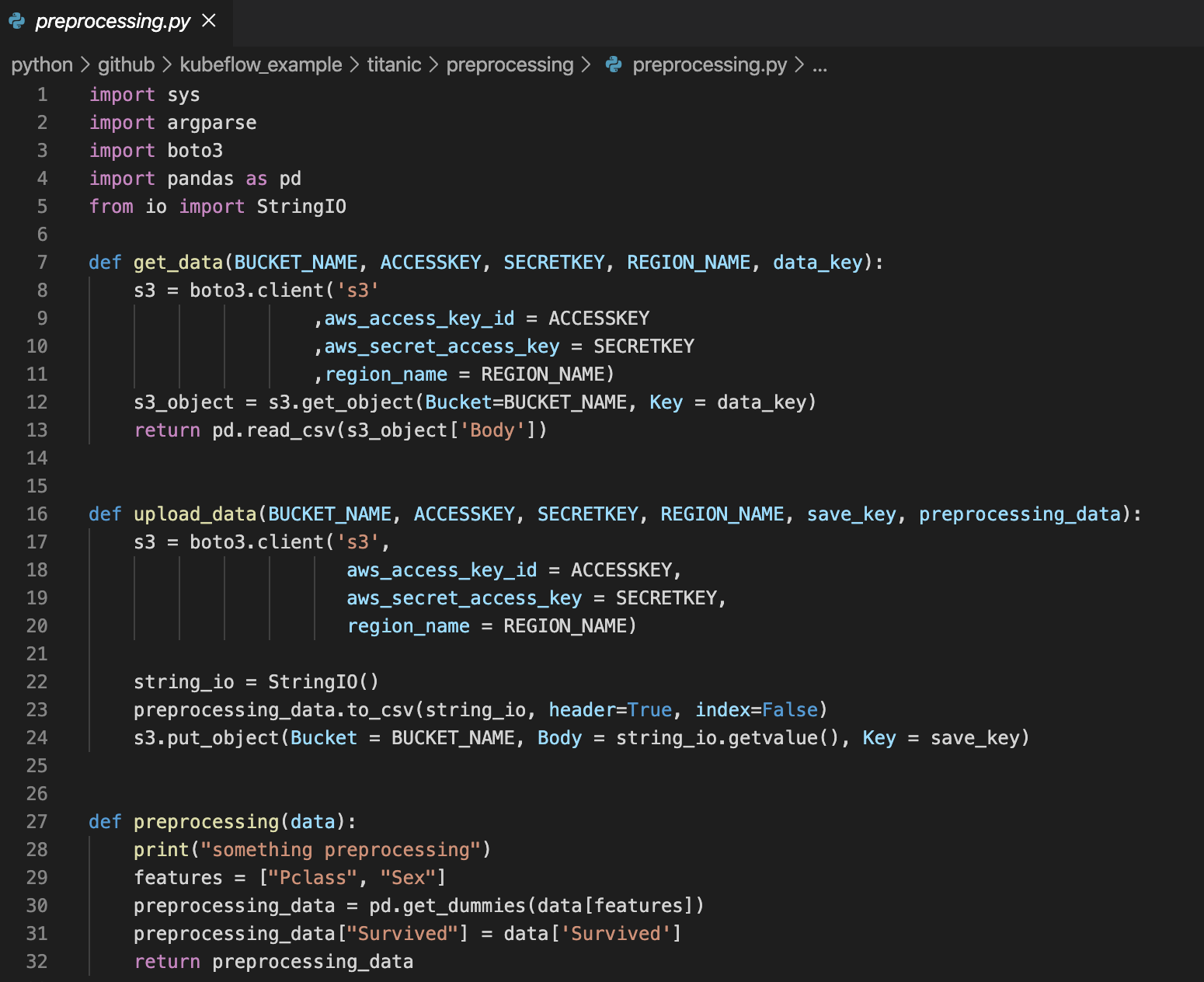preprocessing 단계에서는 말 그대로 전처리 작업을 진행합니다. 위에서도 말씀드렸듯이 여기서는 kaggle의 타이타닉 데이터(titanic)를 활용합니다. 하지만, 이전 포스팅에서는 단순히 local에 데이터를 저장하고 이를 공유하는 방식을 사용했었는데요. 이번에는 이 타이타닉 데이터가 AWS S3에 저장되어 있다고 가정하고 진행합니다. 보통 실무에서는 이렇게 어떤 저장소에 데이터를 올려놓고 활용하지 local에 데이터를 저장하는 방법을 잘 사용하지 않습니다. 그렇기에 그런 방법적인 것을 정리하고자 합니다.