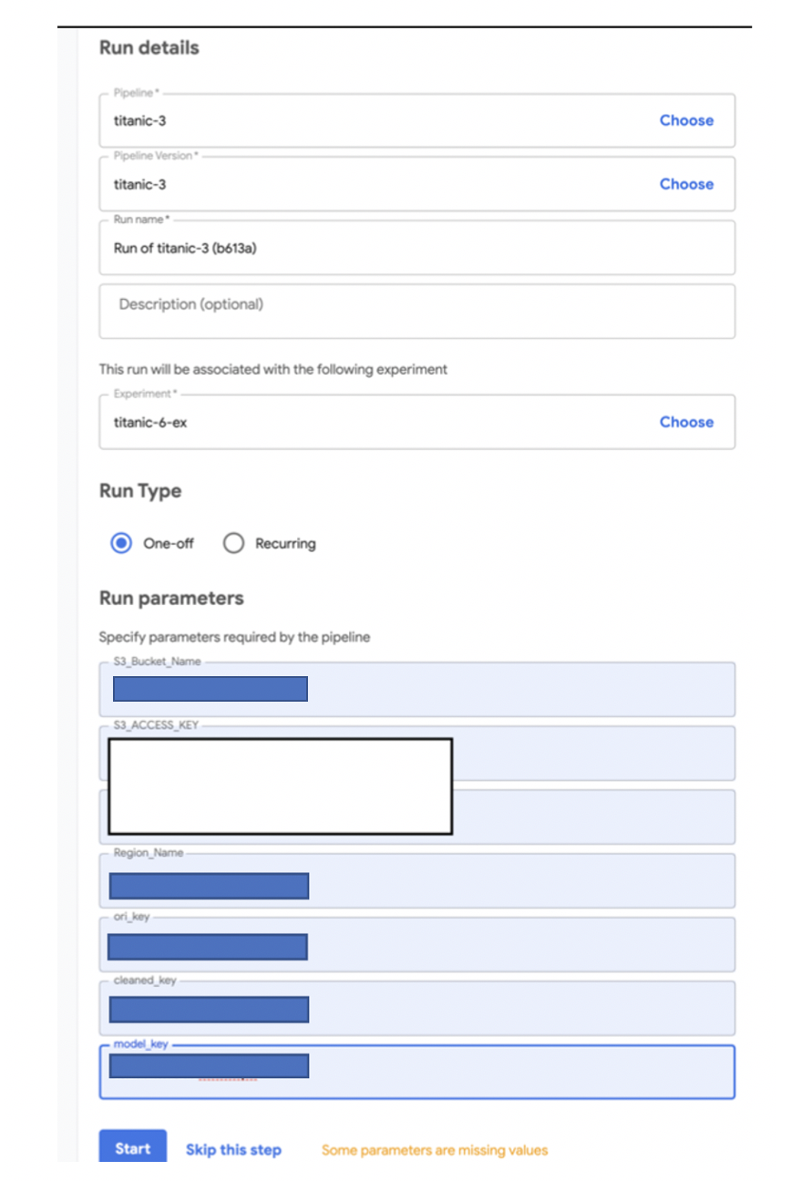이전 글에서 kubeflow를 잘 설치하셨다면 kubeflow 환경에 접속하시면 됩니다. 그러면 웹 환경을 볼 수 있는데요. 거기서 pipelines를 클릭하신 다음 upload pipeline에 들어가서 위에 만들었던 tar.gz를 올려줍니다. 그러면 새로운 pipeline이 잘 올라가는데요! 이제 여기서 create experiment를 클릭하셔서 실험 화면에 들어갑니다. 그러면 아래와 같은 화면이 나오고, 아까 우리가 지정했던 argument 값들을 채워주시면 되겠습니다.