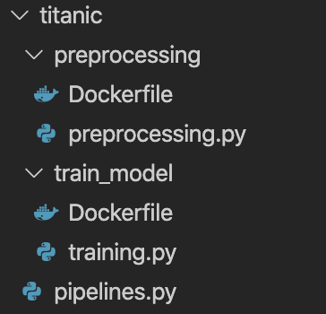 - 현재 저의 kubeflow example에서는 2개의 디렉토리와 각 디렉토리에 2개의 파일이 존재합니다. 그리고 pipelines.py 파일이 있습니다 .
