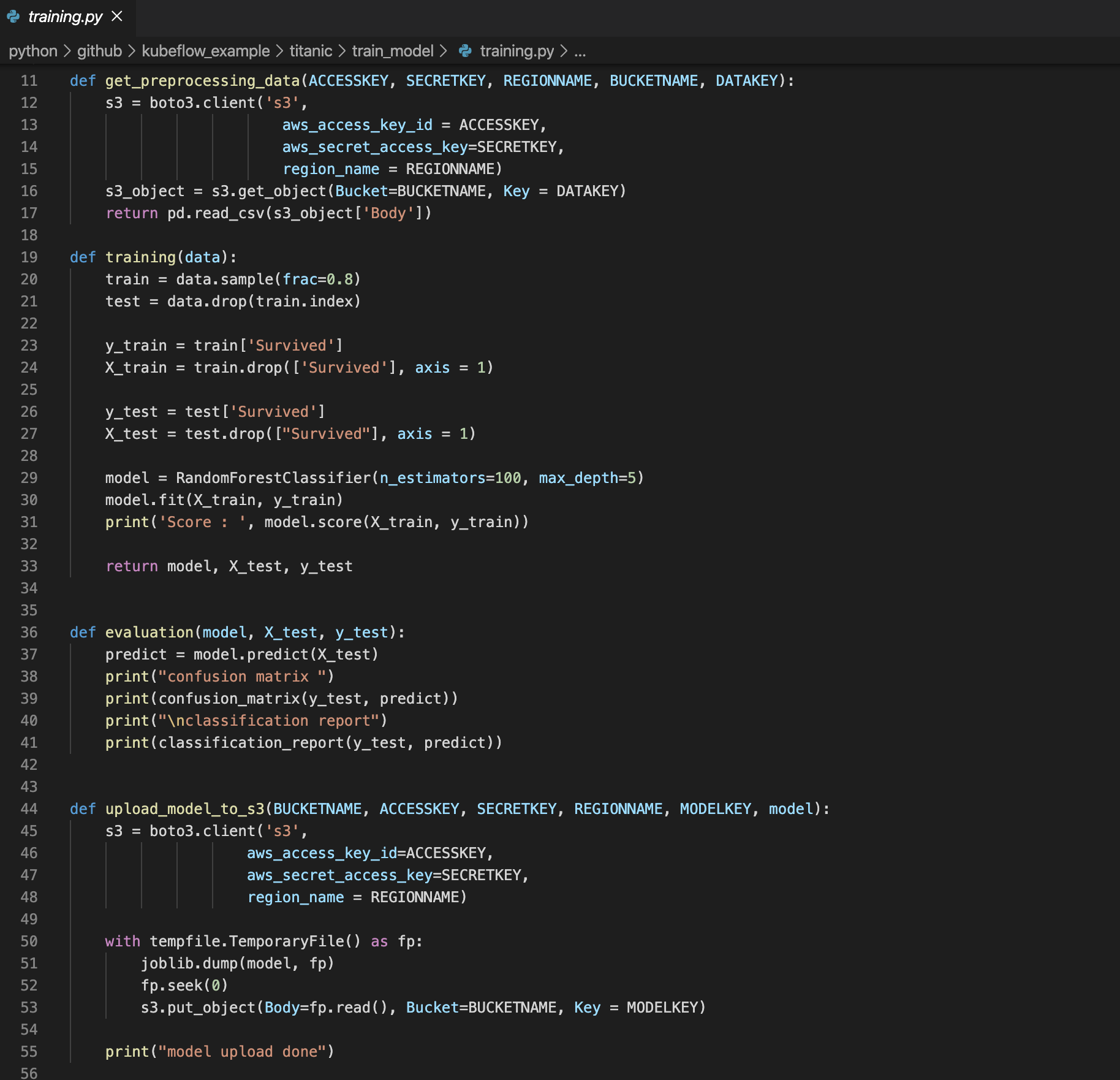 - training : 해당 데이터를 활용해서 machine learning model을 훈련 시켜줍니다. 여기서는 굉장히 간단하게 진행했습니다. preprocessing 때와 마찬가지로 kubeflow example 설명을 위한 목적이지, model 고도화의 목적이 아니기 때문입니다. 만약, 더 고도화 된 model을 만들고 싶으시면 training 함수를 더 멋지게 만들어주시면 됩니다.
