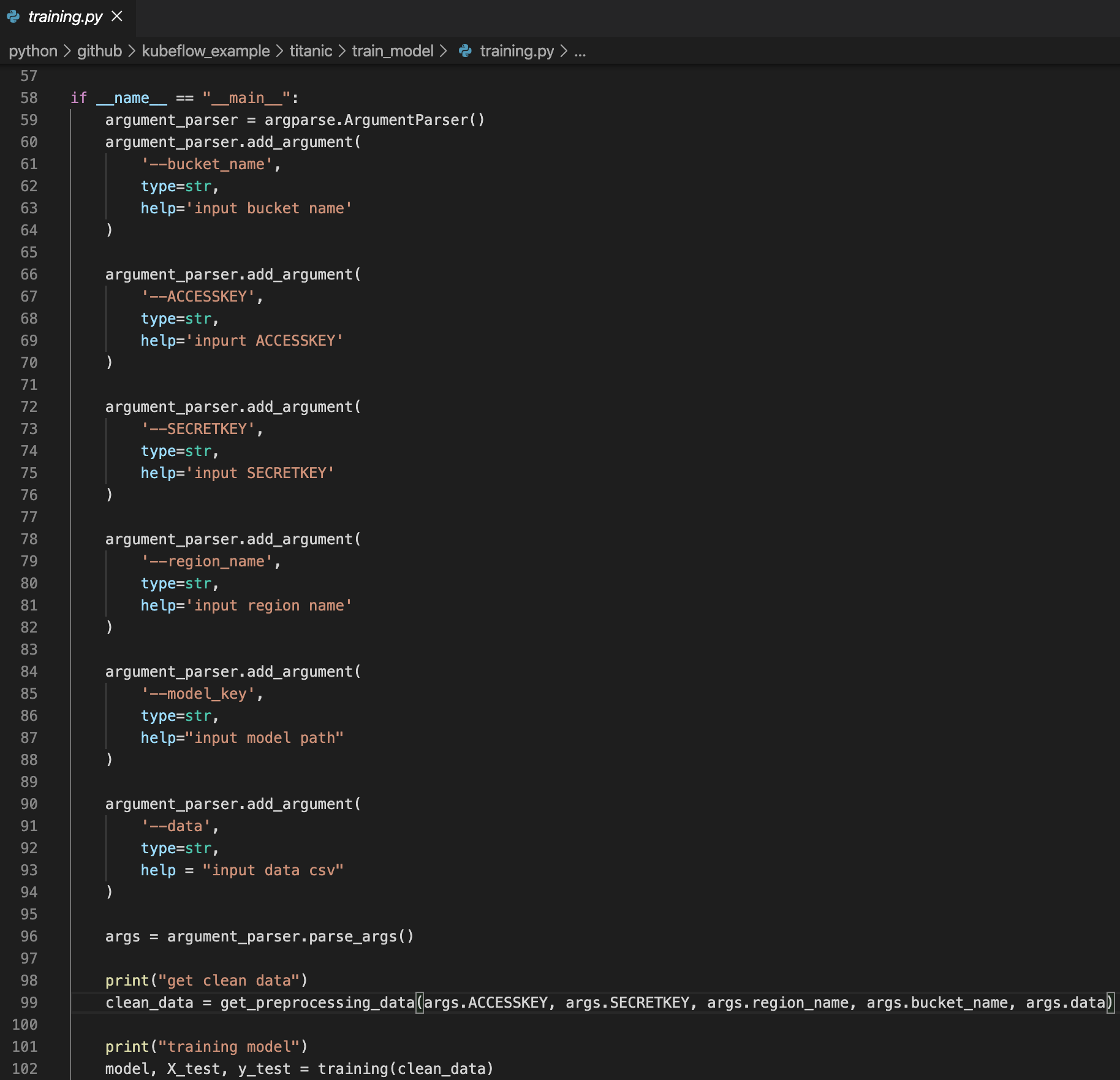 여기서도 preprocessing step과 동일하게 AWS 정보를 필요로 합니다. 단, preprocessing 때와 동일한 argument 이름을 가지고 받도록 하면 kubeflow 실행 시 한 번만 정보를 입력 받으면 되므로 argument 이름을 똑같이 해주면 편합니다.