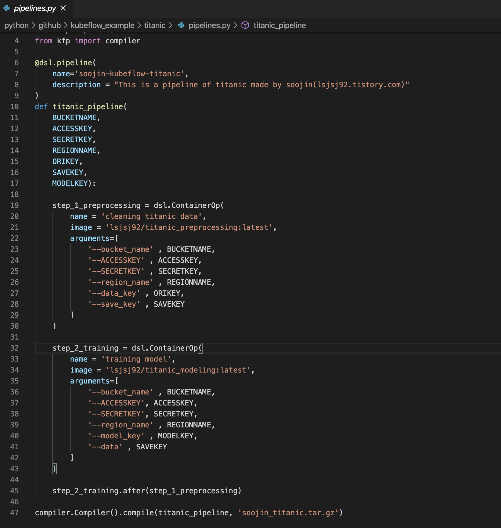 이제 kubeflow에 활용되는 각 step 따른 코드와 각 step의 정보를 담은 docker image를 전부 생성했습니다. 이제 kubeflow에서 위에 정보를 활용해서 동작될 수 있도록 pipeline 코드를 작성합니다.