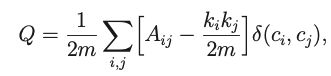 - modularity 변화량 : 노드 i가 community에 배속된 상태 modularity - i가 배속되지 않은 상태의 modularity