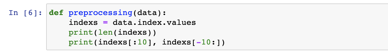 저는 이 데이터를 처리하는 함수 preprocess 함수를 만들었는데요. 이 함수의 역할은 단순히 index 번호를 출력해주는 함수입니다.