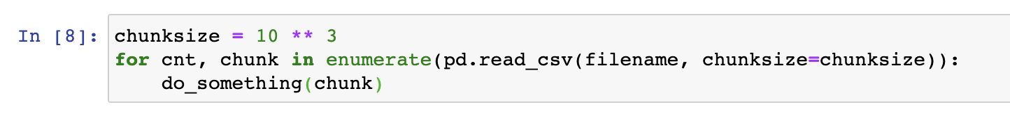 - do_something(chunk) : chunk는 읽어온 데이터입니다. pandas의 read_csv에서 읽어온 형식으로 읽어오는데, chunksize만큼 데이터를 읽어옵니다. 그리고 이렇게 읽어온 데이터를 가지고 do_something에 돌려서 데이터를 처리하는 것입니다.