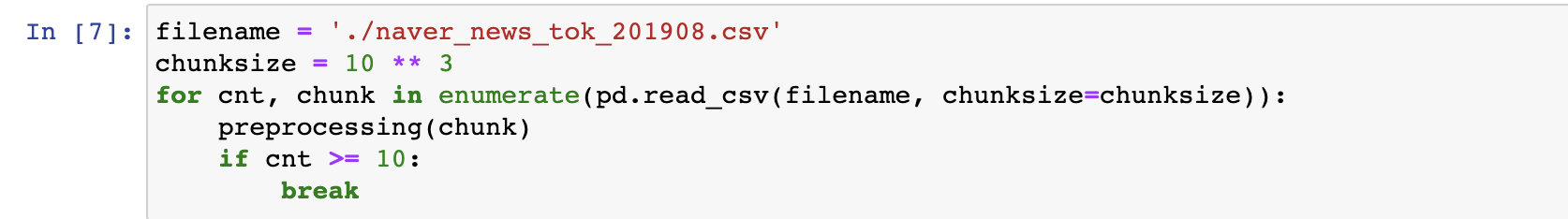 - chunksize : loop때마다 csv 데이터를 읽어올 양입니다. 10 ** 3 은 1000인데요. 이는 한 번에 1000개의 데이터를 가져온다는 뜻입니다.