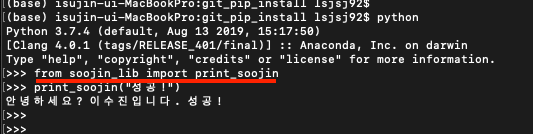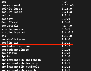 자! 밑에 successfully installed 하면서 install require에 적어두었던 numpy와 제가 만든 패키지인 soojin_lib이 설치가 되었습니다.