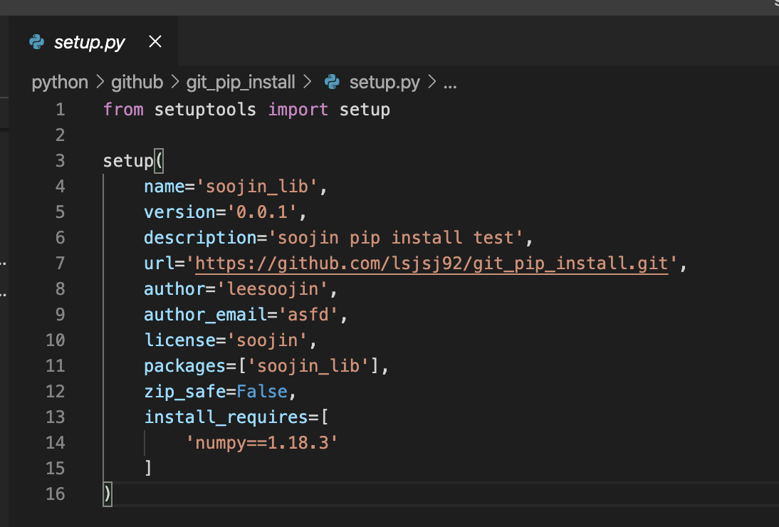 이제 여기까지 되었으면 git을 이용해서 pip install 할 준비를 다 마쳤습니다. 이제 pip install을 이용해서 github에 있는 Package를 설치해볼까요? 설치 명령어는 아래와 같습니다.