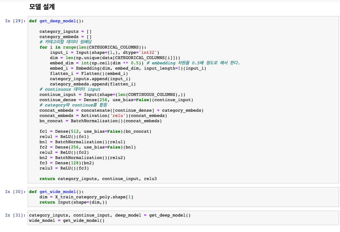 이제 모델 설계 부분입니다. 모델 설계는 wide한 영역과 deep한 영역 2개가 존재하기 때문에 2개를 만들어야합니다.