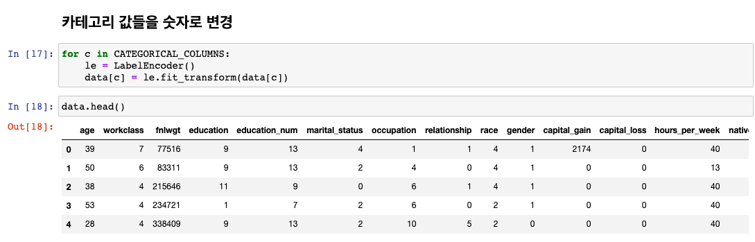 간단하게 categorical feature 값들을 숫자로 변경해줍니다. label로 변경해주는 것은 sklearn의 LabelEncoder를 활용합니다.