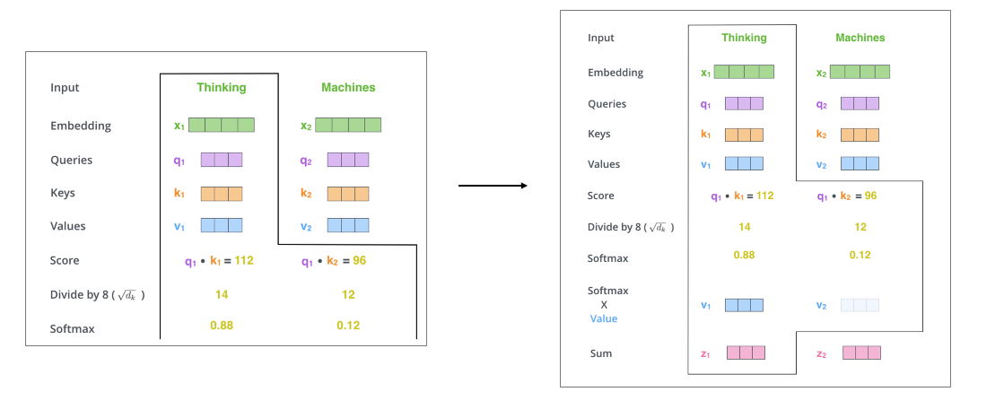위 그림을 보면 scaled dot product attention이 어떻게 동작되는지 직관적으로 이해가 되실겁니다. divide by 8이라는 부분은 너무 값이 커서 softmax가 한 쪽에 치우치지 않도록 scaled를 해주는 역할을 합니다.