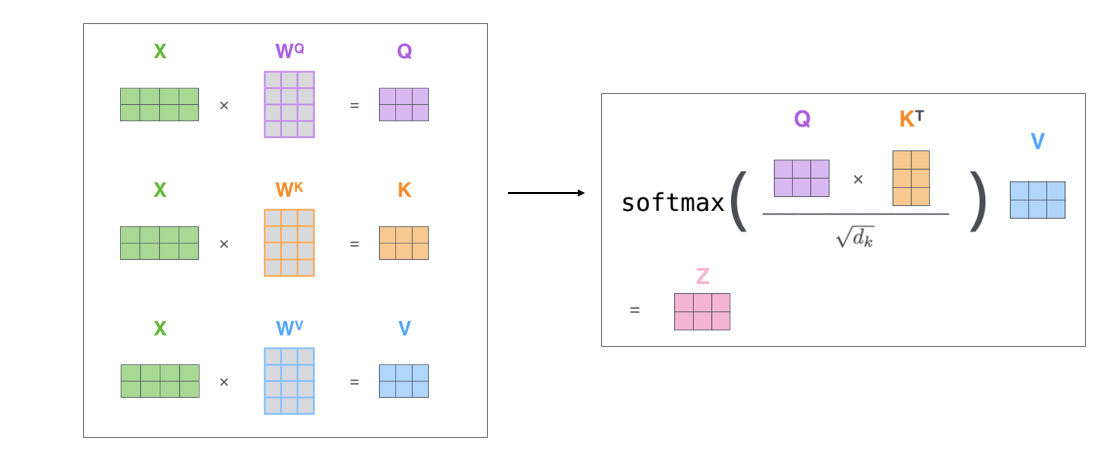단일 값에서 행렬로만 변했을 뿐 과정은 동일합니다. 그래서 마지막에 나오는 Z가 scaled dot product attention결과로 나오게 됩니다.