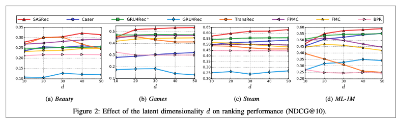 본 논문에서는 다양한 dataset(Dense하거나 Sparse한)에서 다른 모델들과 비교했을 때 저자들이 만든 SASRec 모델이 SOTA를 달성하며 더 우수한 성능을 보여준다고 이야기하고 있습니다. 또한, 그림2에서는 latent dim을 늘려도 성능이 유지되는 것을 보여주고 있습니다.
