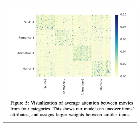 그리고 마지막으로 item 요소끼리의 attention을 보여줍니다. 비슷한 것들끼리 attention weight가 강하게 들어가는 것을 볼 수 있습니다.