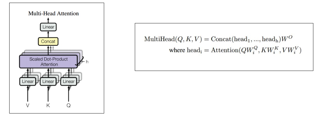 식에서도 직관적으로 볼 수 있지만 scaled dot product attention을 concat해서 하나로 합친 것입니다. 그러면 최종적으로 여러개의 Z가 나오게 되겠죠? ( scaled dot product attention에서는 하나의 Z가 나왔으니까요! )