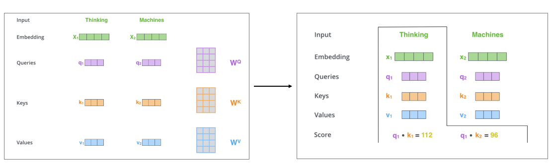 scaled dot product는 위 사진과 같이 Q, K의 곱에 softmax를 취하고 이것을 value에 matmul하는 방식으로 진행됩니다. 이것에 대한 예제는 아래와 같습니다. (해당 사진들은 jallammar의 블로그에서 인용하였으며, 해당 블로그는 개요에 링크를 달아두었습니다.)