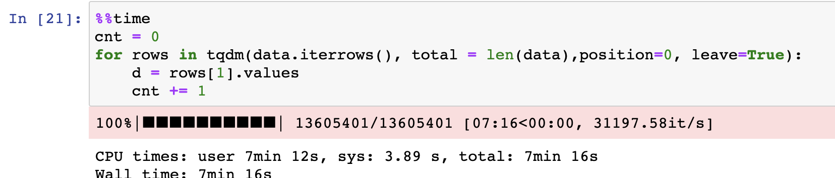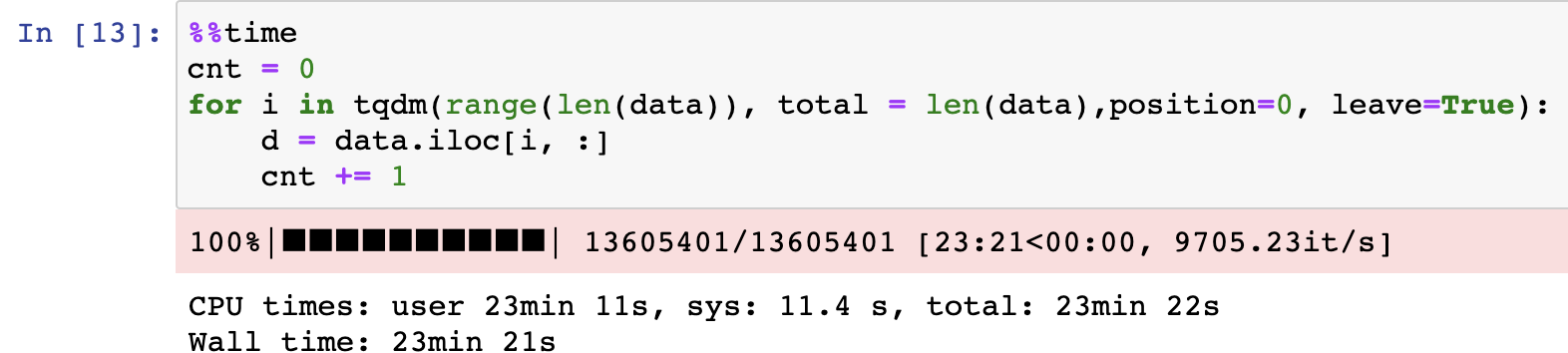 아까 데이터를 볼 떄 1300만 row가 있는 데이터입니다. iloc 식으로 데이터를 접근하면 대략 23분이라는 시간이 걸립니다.