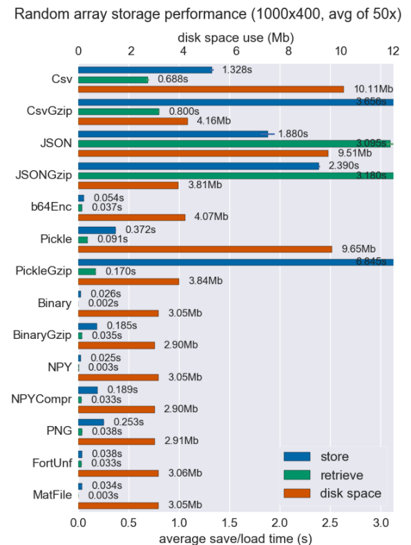 위 사진을 보면 데이터 포멧에 따라 디스크 저장 공간, 참조 시간 등의 지표를 보여줍니다. 근데 흔히 우리가 사용하는 CSV, JSON보다 pickle 같은 데이터가 더 빠르게 데이터를 불러오는 것을 불러올 수 있습니다. 저는 여기서 추가적으로 npy(numpy) 파일로 저장하는 방법도 소개하려고 합니다. 왜냐하면 npy와 pickle을 비교해보면 numpy가 훨씬 더 적은 용량을 차지하고 더 빨리 읽어오기 때문입니다.