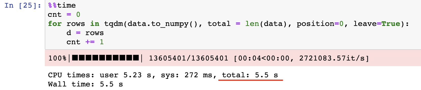 가장 최고의 성능을 보여줍니다. Pandas Dataframe을 to_numpy()로 numpy 형태로 바꿔준 뒤 데이터를 접근하면 굉장히 빠르게 접근할 수 있습니다. 무러 5.5초만에 다 접근이 되었네요. 가장 좋은 성능을 보여주죠? 즉, dataframe의 row단위로 데이터 접근할 때는 to_numpy()로 데이터를 접근하는 것이 굉장히 빠르게 처리할 수 있다는 것을 보여줍니다.