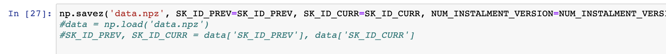 npz로 저장하면 마치 key-value 형태로 데이터를 저장할 수 있습니다. key는 column, value는 그에 대한 값이 저장될 수 있도록 합니다. 아래와 같은 방법으로 적용할 수 있습니다.