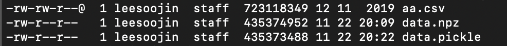 npz나 pickle로 저장할 경우 둘 다 기존 데이터보다 감소한 값으로 저장된 것을 볼 수 있습니다. 그리고 처음 사진에서 보여드린 것처럼 npz는 불러오는 속도가 더 빠른 것도 확인할 수 있으실겁니다.