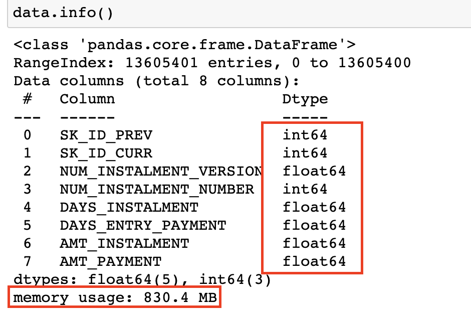 이 pandas dataframe의 info() 함수를 통해 정보를 봐보면 실수는 float64, 정수는 int64로 되어있습니다. 그에 따른 메모리는 830.4MB입니다. 거의 1G이죠. 이제 이거를 불필요한 메모리를 사용하지 않고 제대로 사용하기 위해 줄여봅니다.
