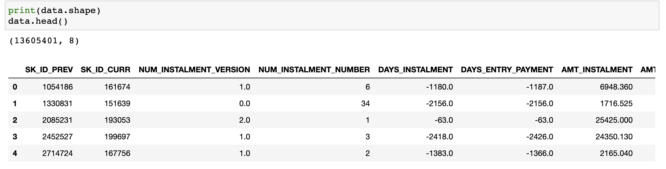 사용한 데이터는 kaggle의 homecredit 데이터(www.kaggle.com/c/home-credit-default-risk/data)중 installments_payment.csv를 사용했습니다.