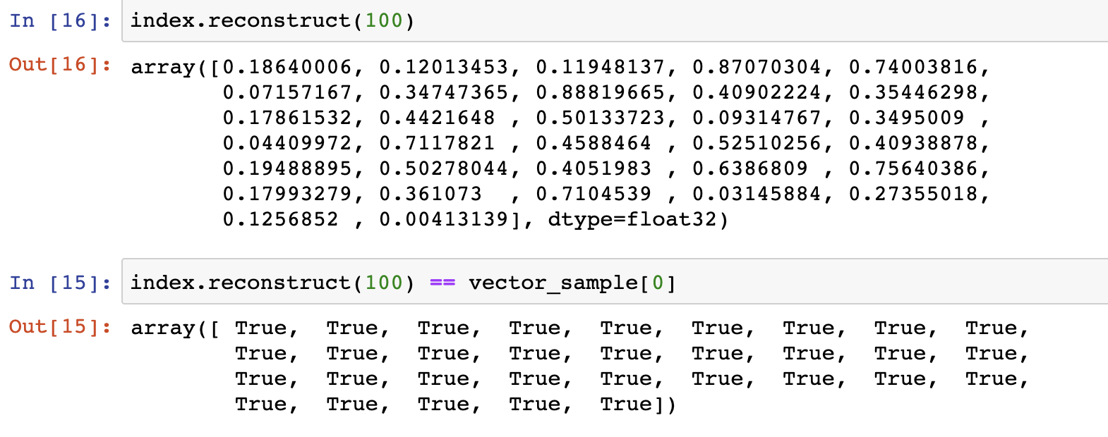 그러면 여기서 궁금한 점이 생길겁니다. Faiss로 구한 벡터 유사도(vector similarity)를 구했는데 그 역을 구할 수 있을까? 그니까 id 값을 넣으면 해당 id 값의 vector를 뽑을 수 있을까? 를 생각하게 됩니다.