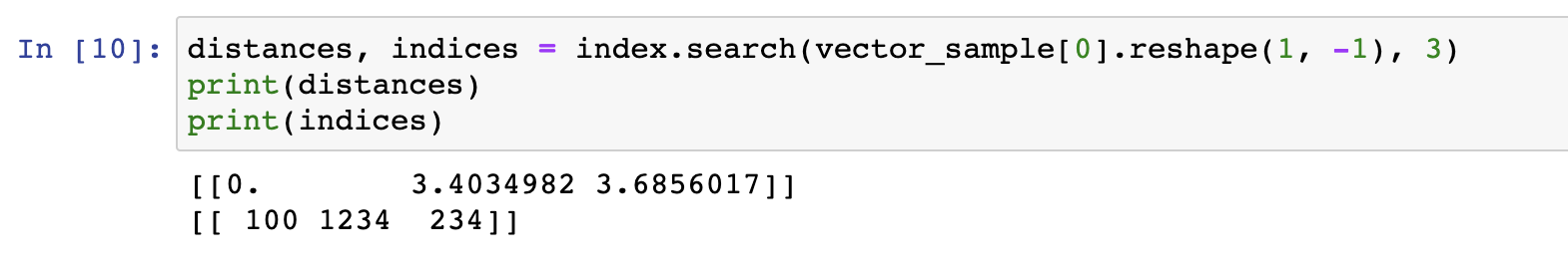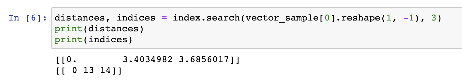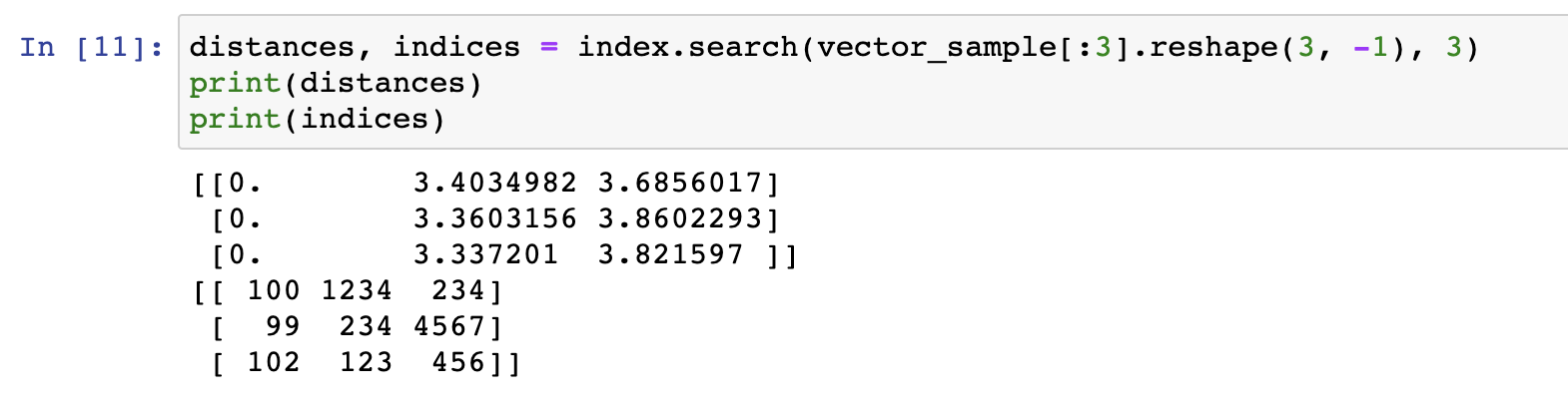 vector sample의 첫 번째 값을 (1, 32) 형태로 shape를 변경해 index.search 함수에 넣어줍니다. 그리고 3이라는 것은 가장 유사한 값 3개를 가지고 오는 것입니다.