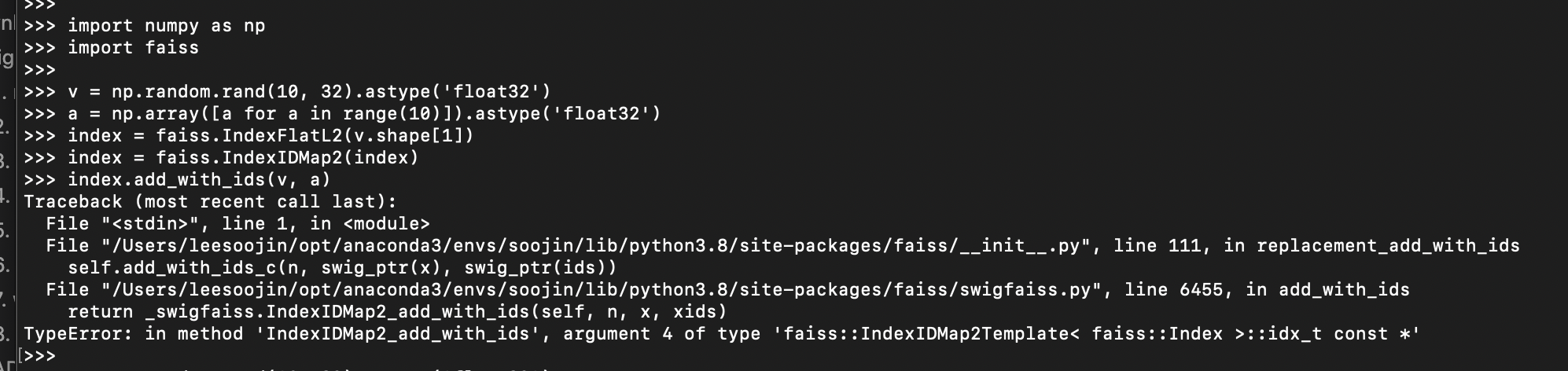 File "/Users/leesoojin/opt/anaconda3/envs/soojin/lib/python3.8/site-packages/faiss/__init__.py", line 111, in replacement_add_with_ids