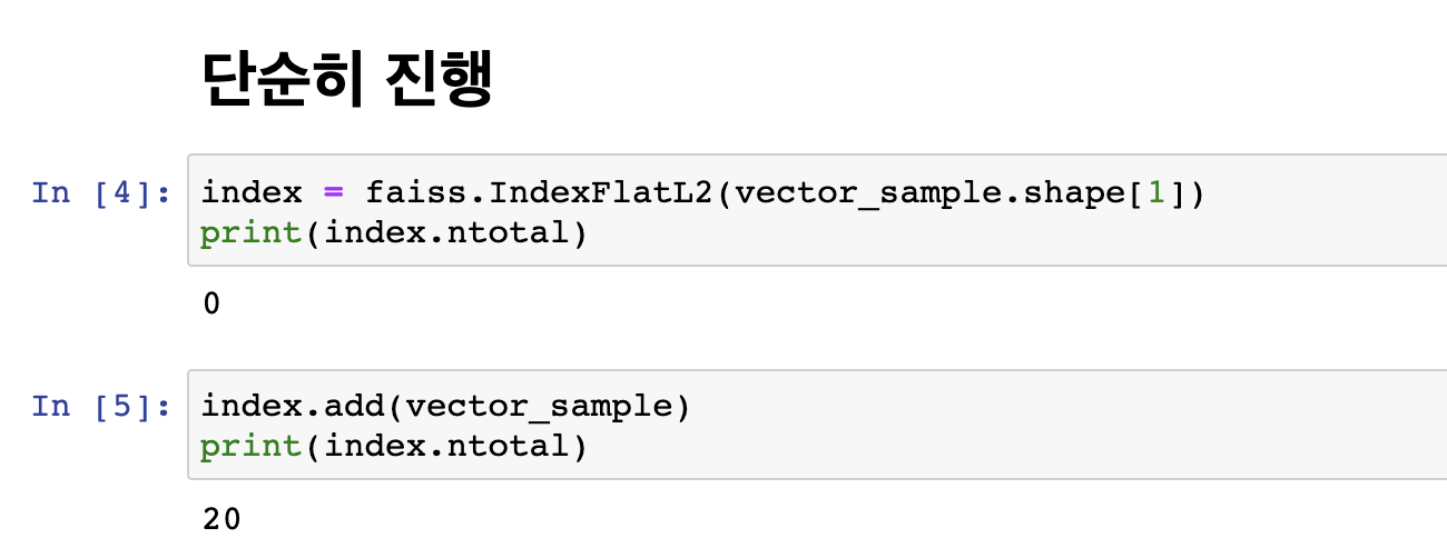 그리고 단순히 사용하는 방법은 faiss의 IndexFlatL2함수를 호출해서 벡터의 차원이 어떻게 되는지 알려줍니다. 이후에 해당 faiss의 객체에 대해서 add 함수로 vector 값을 넣어주면 됩니다.