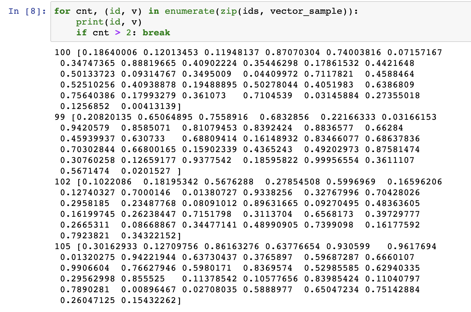 자! 위에서 언급한 문제를 해결해봅시다. 처음에 제가 만든 vector sample이 20개의 vector 값이 32차원으로 있었는데요. 이 20개의 vector 값에 해당되는 ID 값을 넣어주겠습니다.