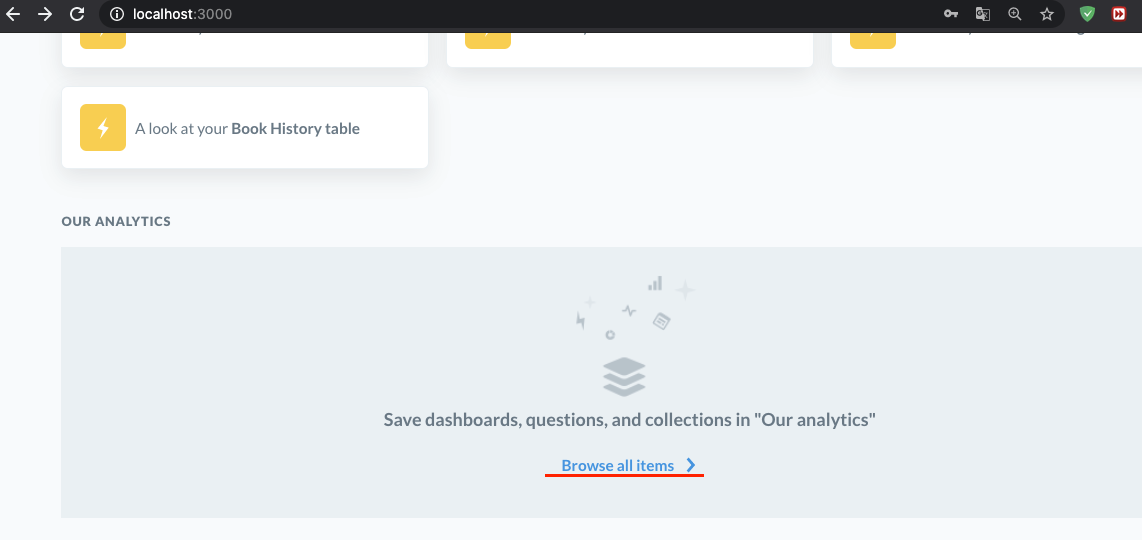 메타베이스 메인 화면을 보면 our analytics 섹션이 존재합니다. 여기에 분석을 한 자료를 모을 수 있습니다.